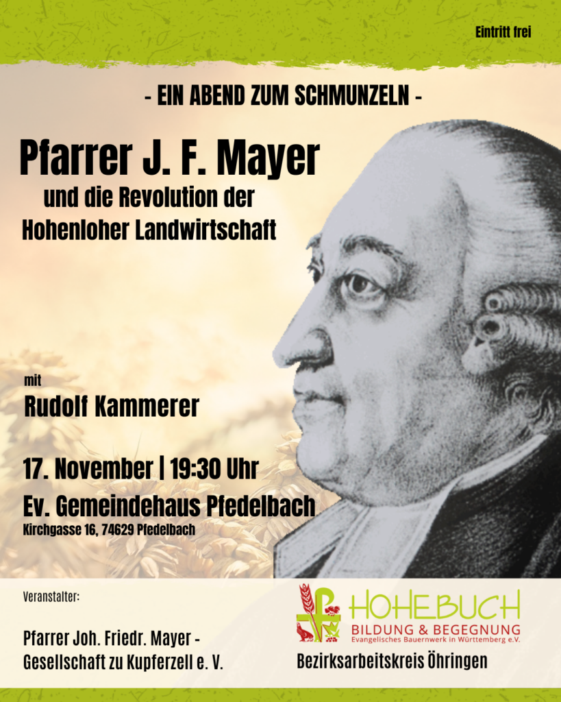 Unter dem Motto „Pfarrer J. F. Mayer und die Revolution der Hohenloher Landwirtschaft“ stellt Rudolf Kammerer Lehre und Schriften des Kupferzeller Pfarrers und Agrarreformers vor. Johann Friedrich Mayer war im 18. Jahrhundert ein Visionär und veränderte die bäuerliche Welt. Sprache und Ausdrucksweise der damaligen Zeit bringen die Menschen heute – wie auch an diesem Abend – immer wieder zum Schmunzeln.